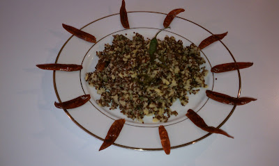 1. HEAT GHEE IN A HEAVY BOTTOMED KADAI . ADD CUMIN SEEDS, RED CHILLIES, ASAFOETIDA AND CURRY LEAVES .